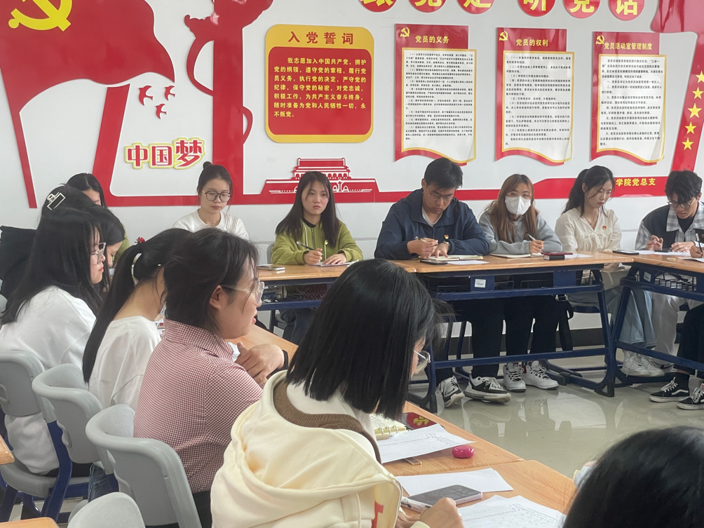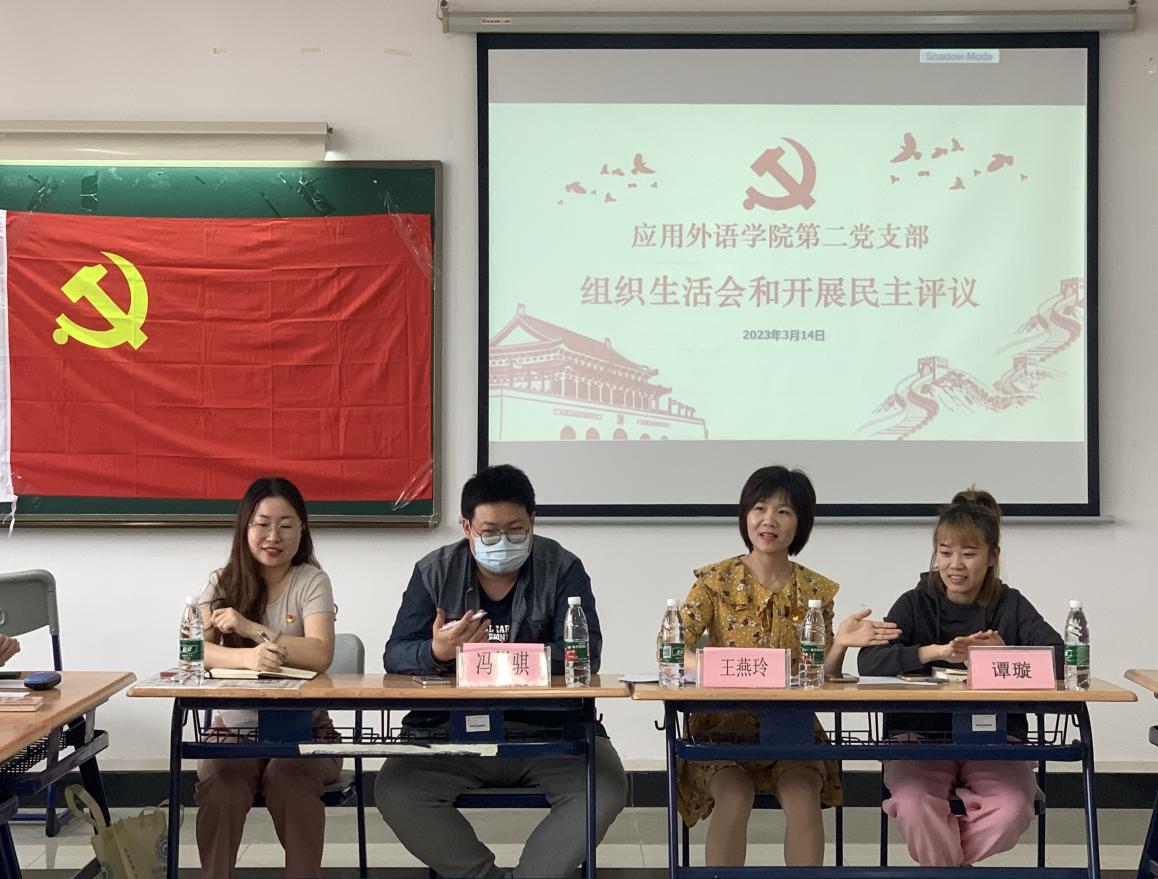 为深入学习贯彻习近平新时代中国特色社会主义思想,学习贯彻党的二十大精神,不断推进党支部建设工作,不断提升党员党性修养,提高党员自我完善、自我净化的能力,3月14日,应用外语学院学生第二党支部于在明德楼1-618召开支部组织生活会和开展民主评议会议。会议由学生第二党支部书记王燕玲主持,支委冯锐骐、辅导员谭璇、许瑞如以及支部的在校党员参加了本次会议。