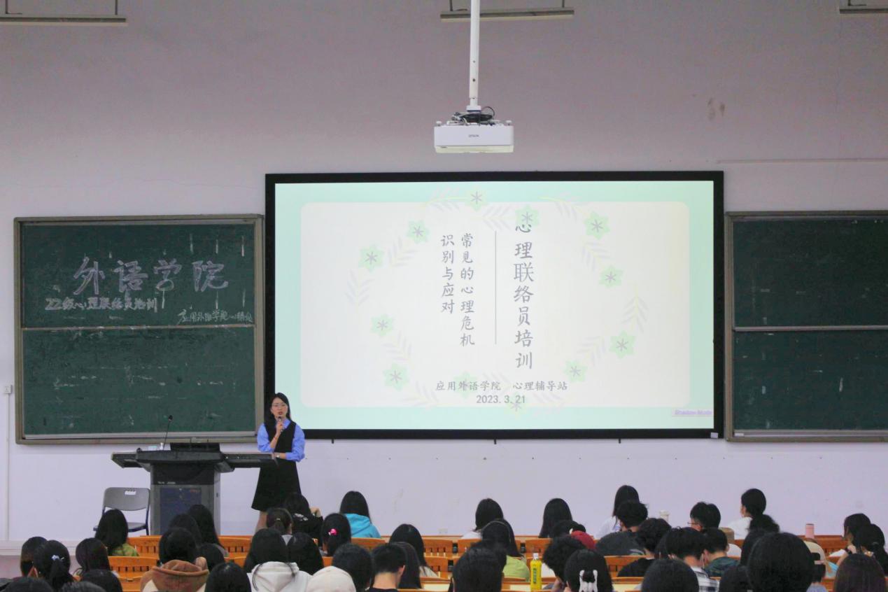 习近平总书记在党的二十大报告指出:“重视心理健康和精神卫生”。《全面加强和改进新时代学生心理健康专项行动计划(2023—2025年)》也被列入《健康中国行动2023年工作要点》。为进一步强化学生心理健康防护网,提高我院心理联络员对心理危机的判断识别能力,增强心理联络员协助学院与心理老师开展心理辅导相关工作的能力,更好地提高心理联络员专业知识水平和工作能力,3月21日下午,应用外语学院心理辅导站在教学楼2-306开展22级心理联络员培训。参与本次培训的有学院心辅站副站长彭丽娜, 22级各班心理委员和宿舍长共160人。