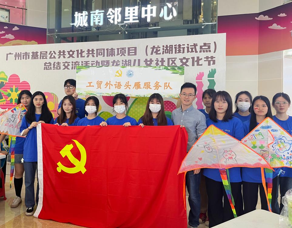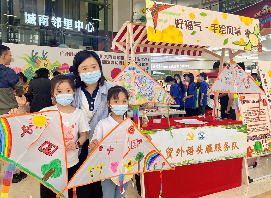 学习贯彻习近平新时代中国特色社会主义思想主题教育总要求,实施二级学院主题教育计划,结合《广东大学生社区实践计划工作方案》,5月13日,应用外语学院头雁服务队(“工贸外语头雁服务队”)深入广州市黄埔区龙湖街道,为基层社区治理提供志愿服务,在龙湖儿女社区文化节现场举办“好福气—手绘风筝”爱心义卖活动。