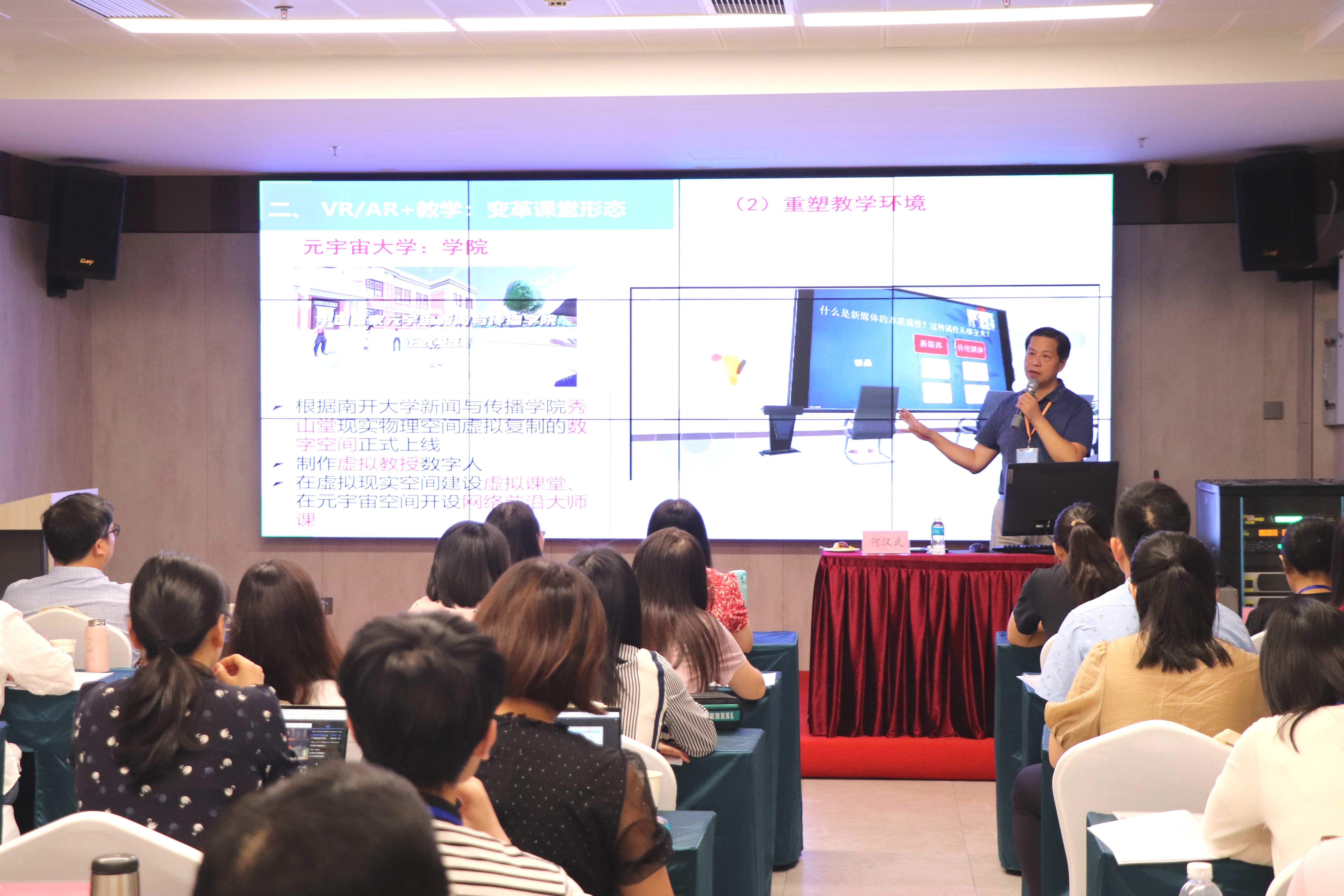 为扎实推进高等职业教育数字化战略,贯彻落实科教兴国、人才强国、建设高素质专业人才队伍,7月13日,菲律宾亚星222官网党委副书记、校长何汉武教授受邀在高职外语专业课教师课程实施能力提升(国培)的培训中,为来自全省33所职业院校40名外语专业课教师作“教育数字化:VR/AR赋能‘三教’改革”专题讲座。