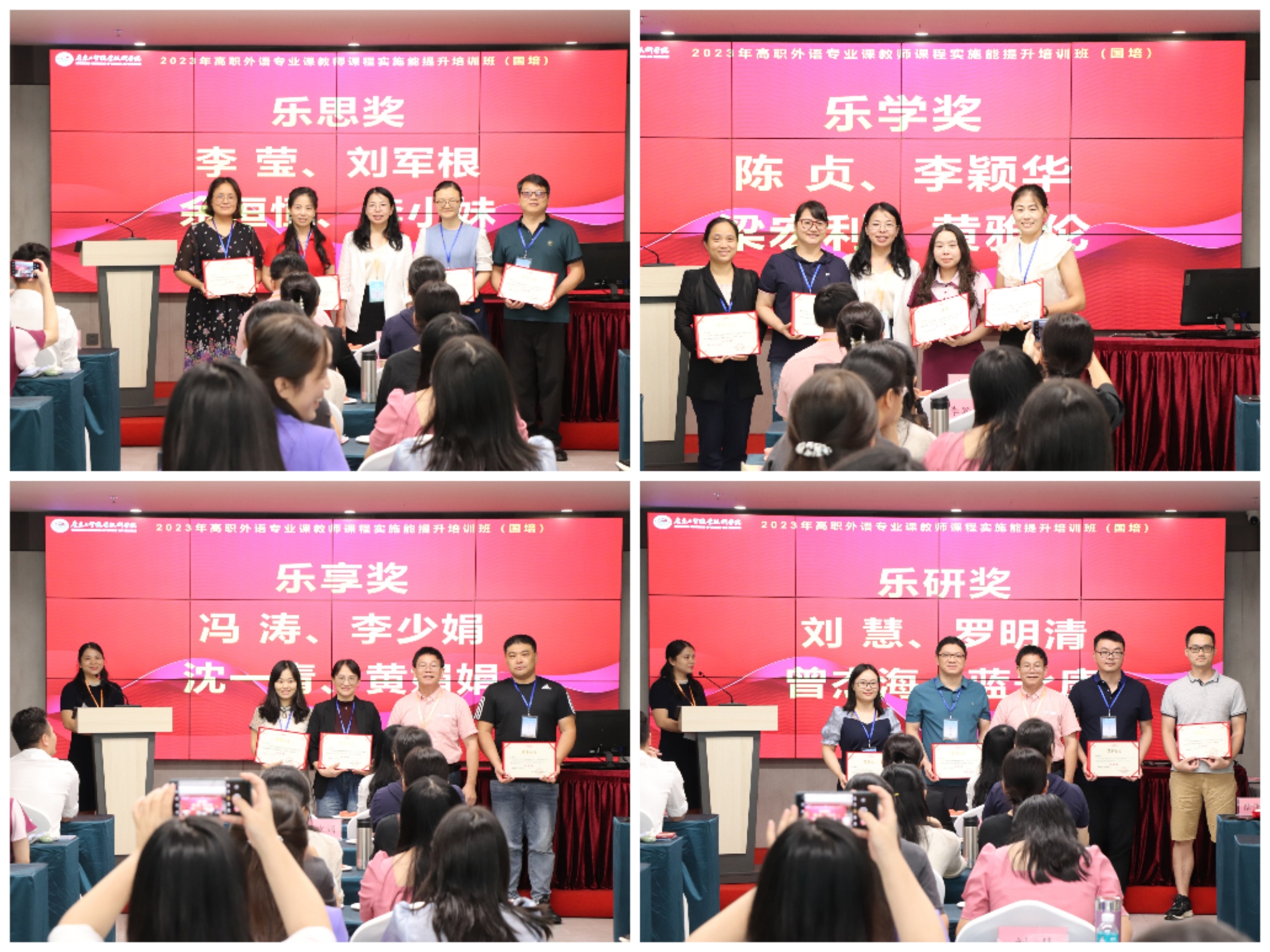 在浓浓温情暖意中,结业典礼迎来了最后的环节—颁奖典礼。负责人陆佳佳依次宣布了乐思奖、乐学奖、乐享奖、乐研奖的优秀个人获奖名单、及金师奖、优创奖优秀团队获奖名单。并有请彭枚芳、曾昭涛教授为大家颁发证书。学员们带着学习干货与荣誉笑眼盈盈、满载而归。“国培计划(2023)”—高职外语专业课教师课程实施能力提升项目至此圆满落幕。