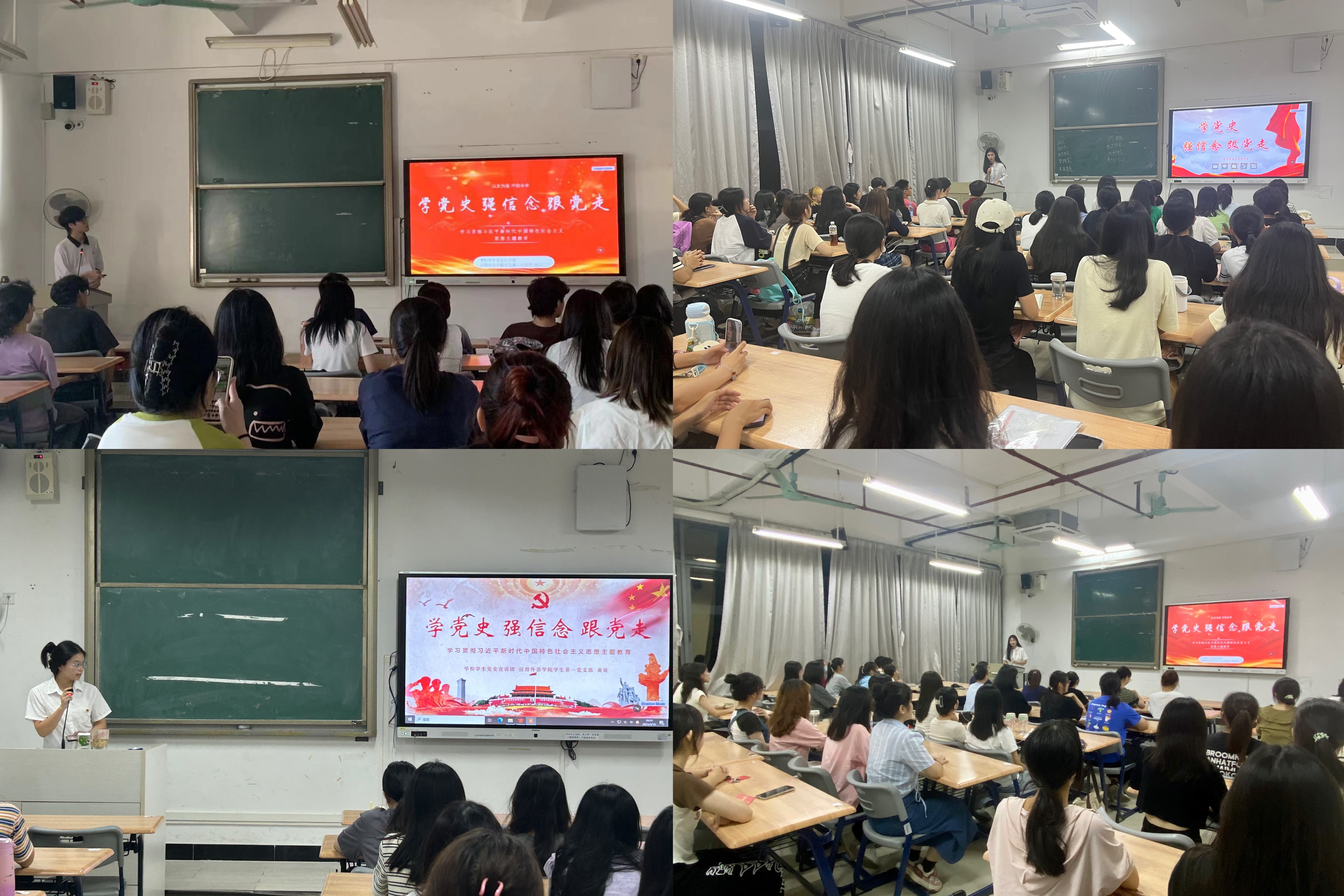 推动党史学习教育常态化长效化,是坚定理想信念、推进伟大事业的必然要求。结合共青团中央近日印发的《关于面向广大团员和青年开展学习贯彻习近平新时代中国特色社会主义思想主题教育的通知》,被聘为学校第三期“学生党史宣讲团”成员、应用外语学院学生第一党支部10名学生党员——彭美华、郑涛、孙依琳、杨潇婷、詹淇淇、陈雅洁、苏泳诗、黄娃、黎芯榆、黄楠于9月深入2023级商务英语专业10个新生班级团支部分别开展党史宣讲暨入党动员工作,面向广大团员和青年开展学习贯彻习近平新时代中国特色社会主义思想主题教育。