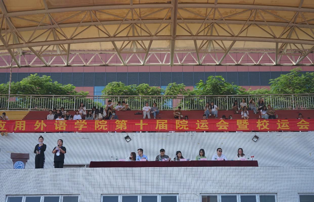 11 月 7 日,应用外语学院第十届运动会在白云校区田径场隆重举行。应用外语学院院长彭枚芳,学工办主任林耀佳,辅导员陈晓玲、冯锐骐、李迪、谭璇、许瑞如及2000多名同学参加了本次运动会开幕式。