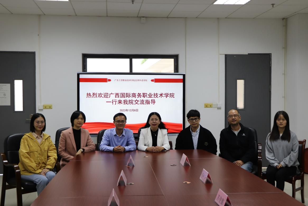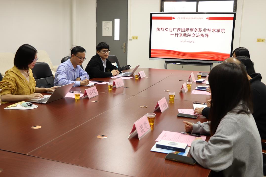 为推进高水平专业建设,进一步深化校企合作,促进职业教育高质量发展。12月8日下午,广西国际商务职业技术学院应用外国语学院院长黄忠电、商务英语教研室主任覃锋、应用英语专业带头人刘王娟一行3人莅临我校交流考察。应用外语学院院长彭枚芳教授、英语系副主任陈锦英博士、学院办公室苏俊懿老师、黄奕老师参加本次交流活动。