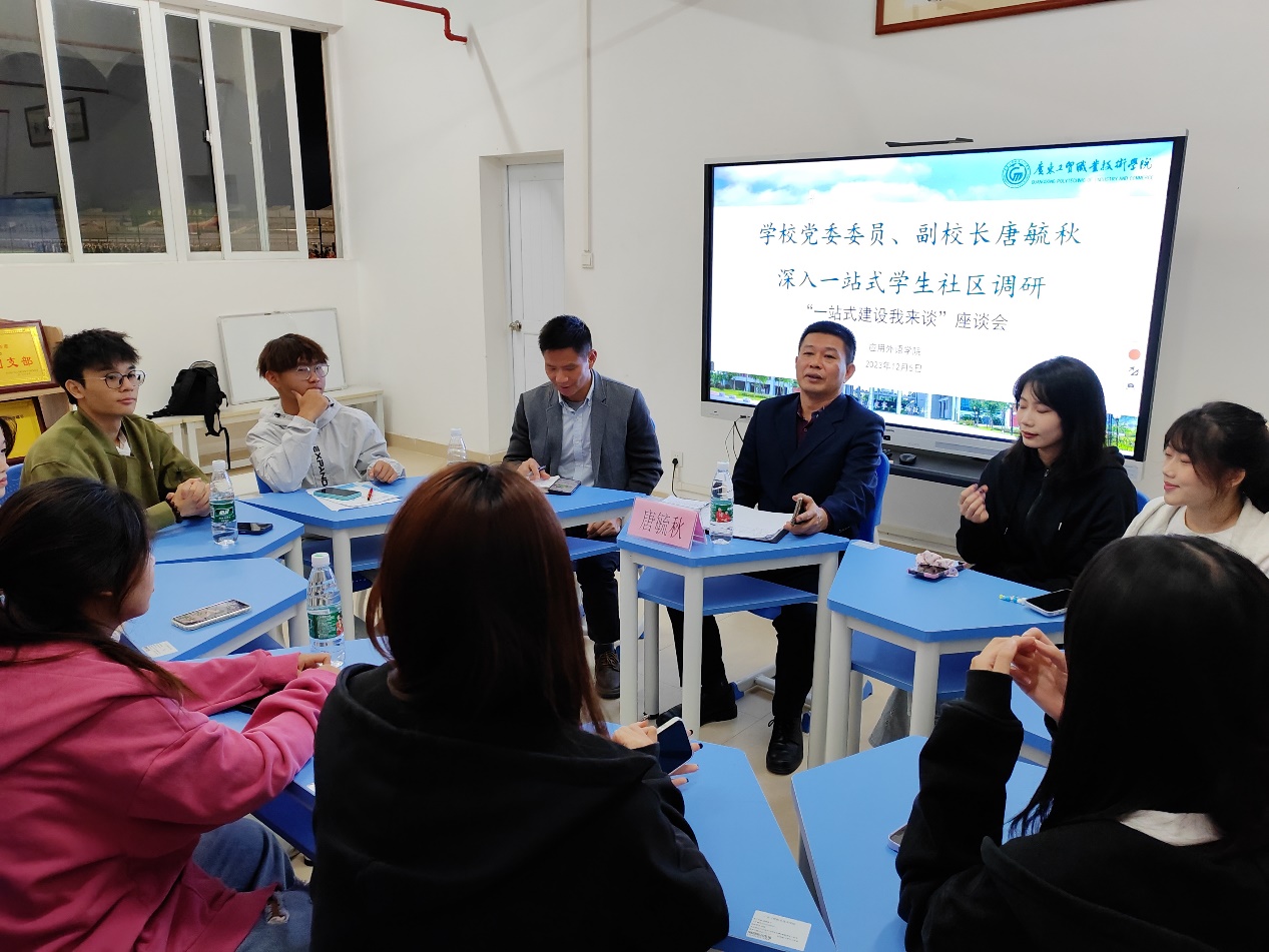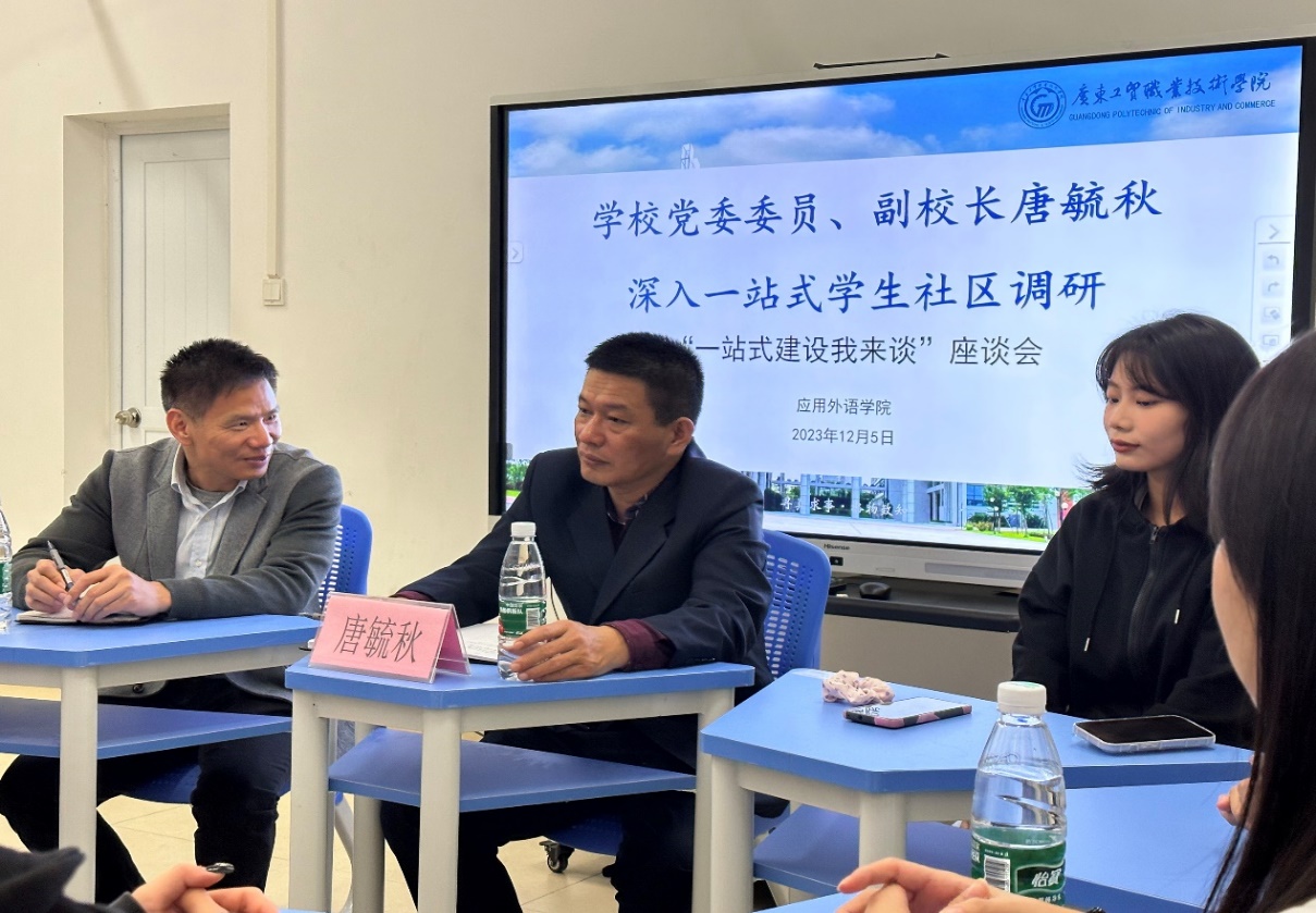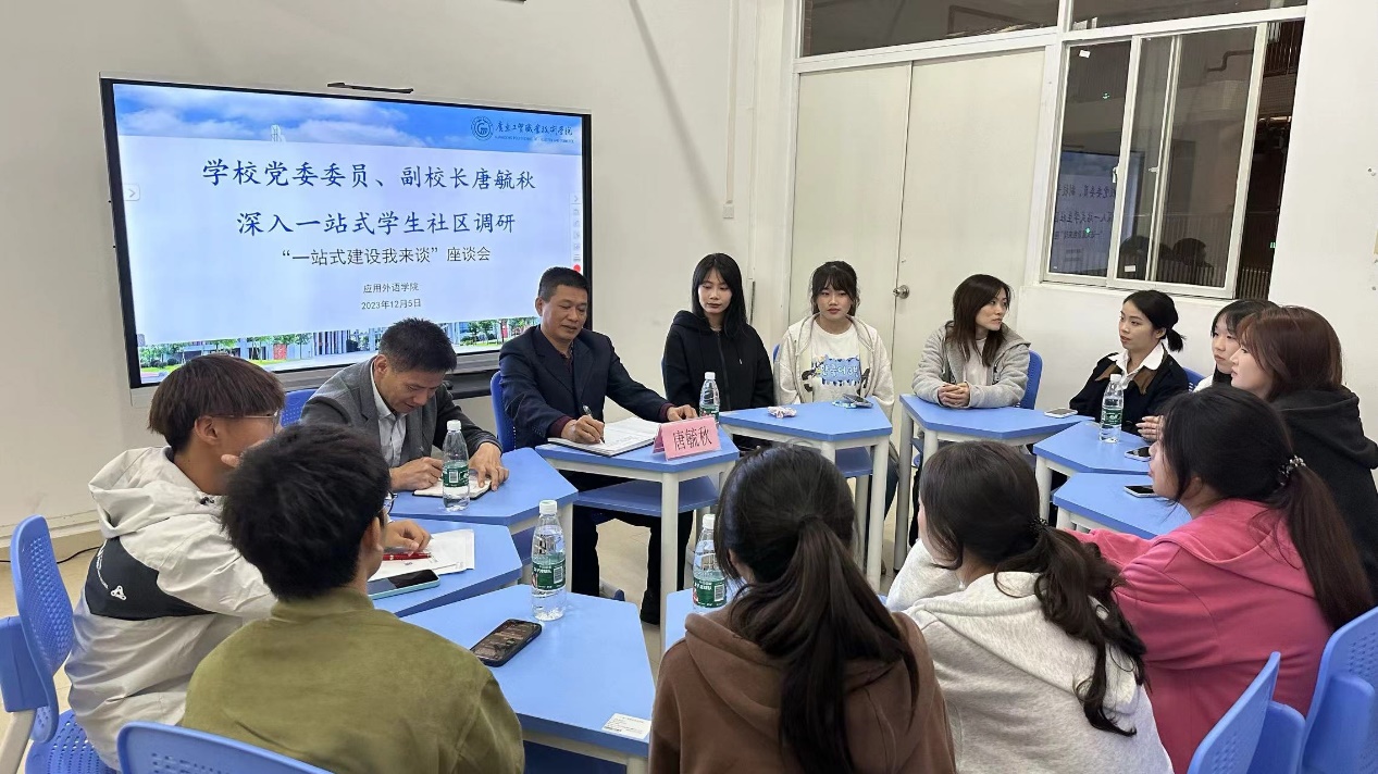 为深入落实“时代新人铸魂工程”,切实解决学生的实际问题,推进学校事业高质量发展。12月5日,应用外语学院在白云校区子博1号“一站式”学生社区召开了“一站式建设我来谈”座谈会。学校党委委员、副校长唐毓秋顺利出席座谈会,应用外语学院党总支临时负责人罗春科、应用外语学院辅导员代表及三个年级学生代表参加座谈交流。会议由罗春科主持。