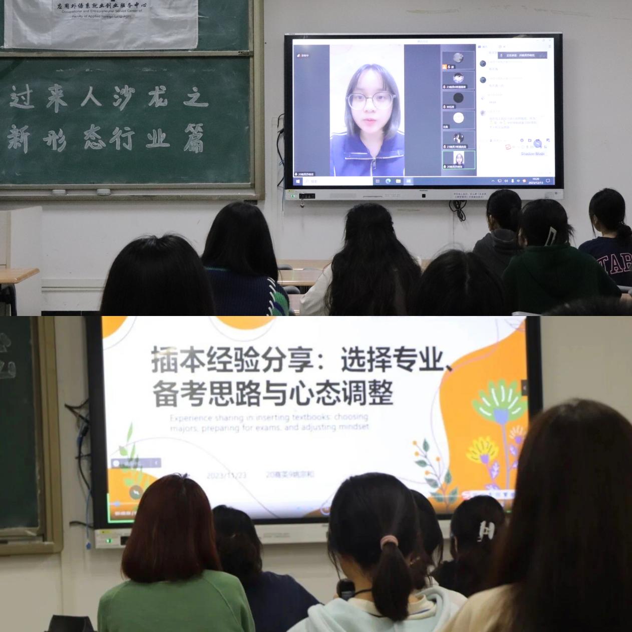 “过来人”经验分享沙龙作为应用外语学院朋辈互助型的学生就业力提升活动,以及课程《大学生职业发展与就业指导》的生涯人物访谈课外延伸活动,自2019年第一届活动至今,打造了一个优秀往届毕业生分享就业、升学有关经验的平台,供在校学子借鉴。本届沙龙活动采用了线上线下相结合的模式,共邀请17位往届优秀毕业生,分为商英专业插本篇、非商英专业插本篇、外贸篇、新形态行业篇以及插本硕士篇五个主题专场。受邀的师兄师姐作为“云分享”嘉宾,就实习、插本备考、考研等方面内容分享了自己的看法和相关经验。线上线下的观众也就自己目前学习以及生活上存有疑惑的地方向嘉宾们进行了提问。嘉宾们倾囊相授,一一回答了观众的问题,现场气氛热烈。活动结束后,同学们纷纷表示收获颇丰,对自己未来人生的规划有了更清晰的方向。