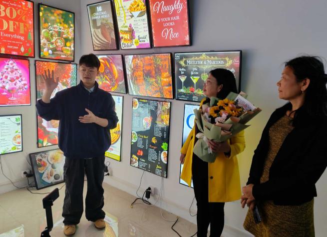在座谈期间,刘萍从企业发展现状、公司产品以及业务运营等方面进行了详细介绍。据悉,公司集产学研销于一体,人员规模达300人以上,整体团队年轻、朝气、温馨而又充满活力!公司目前经营包括路牌、路标、广告牌等标识通过外贸平台以及英文短视频、直播等渠道热销于海外欧美国家,生产规模体量非常大,外语学院优秀校友竹宇现担任公司新媒体运部负责人,为公司开拓外贸直播业务,现在竹宇负责运营情况最好的一个境外直播账号有20万粉丝,全平台粉丝超过100万;新媒体直播使整个企业氛围得到改善 客户量大增,稳定每天300多客户询价,客户价值很高;除了现有的B端(企业端)业务,公司今年新开拓C端(消费者端)业务,每个平台每月有30万美元的业务量,同时在多个平台运营;竹宇带领团队冲在前锋,带领团队迅速发展。