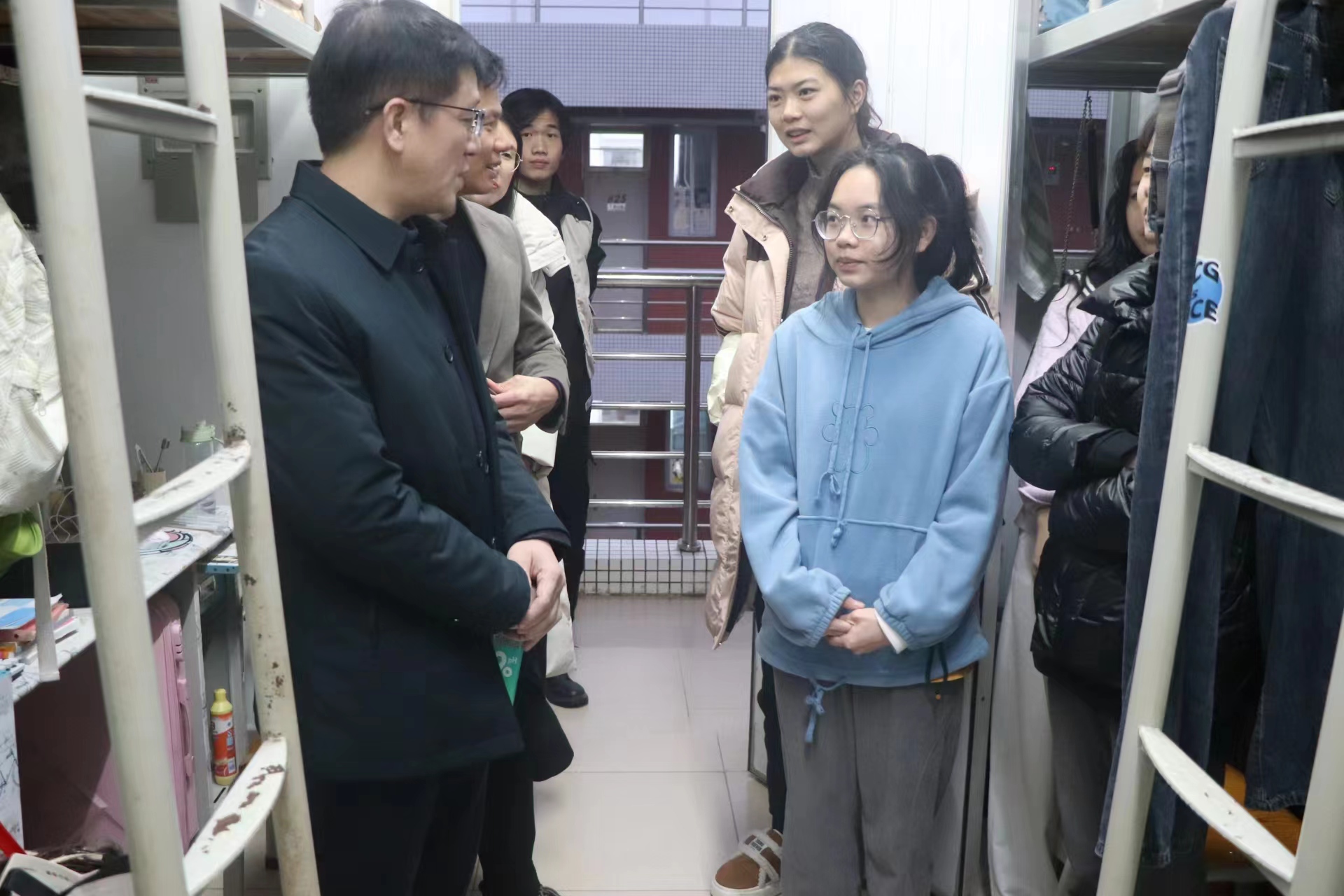 走访过程中,刘贻新与同学们深入交流,了解同学们的学业和生活情况,询问同学们目前是否有遇到问题需要学校和学院提供帮助,勉励同学们锻炼身体、强健体魄、积极参加各项运动,通过运动结交朋友、完善人格,并希望同学们广泛阅读,成为一个有思想的大学生。期间,刘贻新还关切询问同学们的毕业去向规划,鼓励同学们在新学期勤奋学习、继续奋斗,祝愿大家在未来取得理想成绩,并表示学校和学院将切实为毕业生高质量充分就业提供更多的支持与帮助。