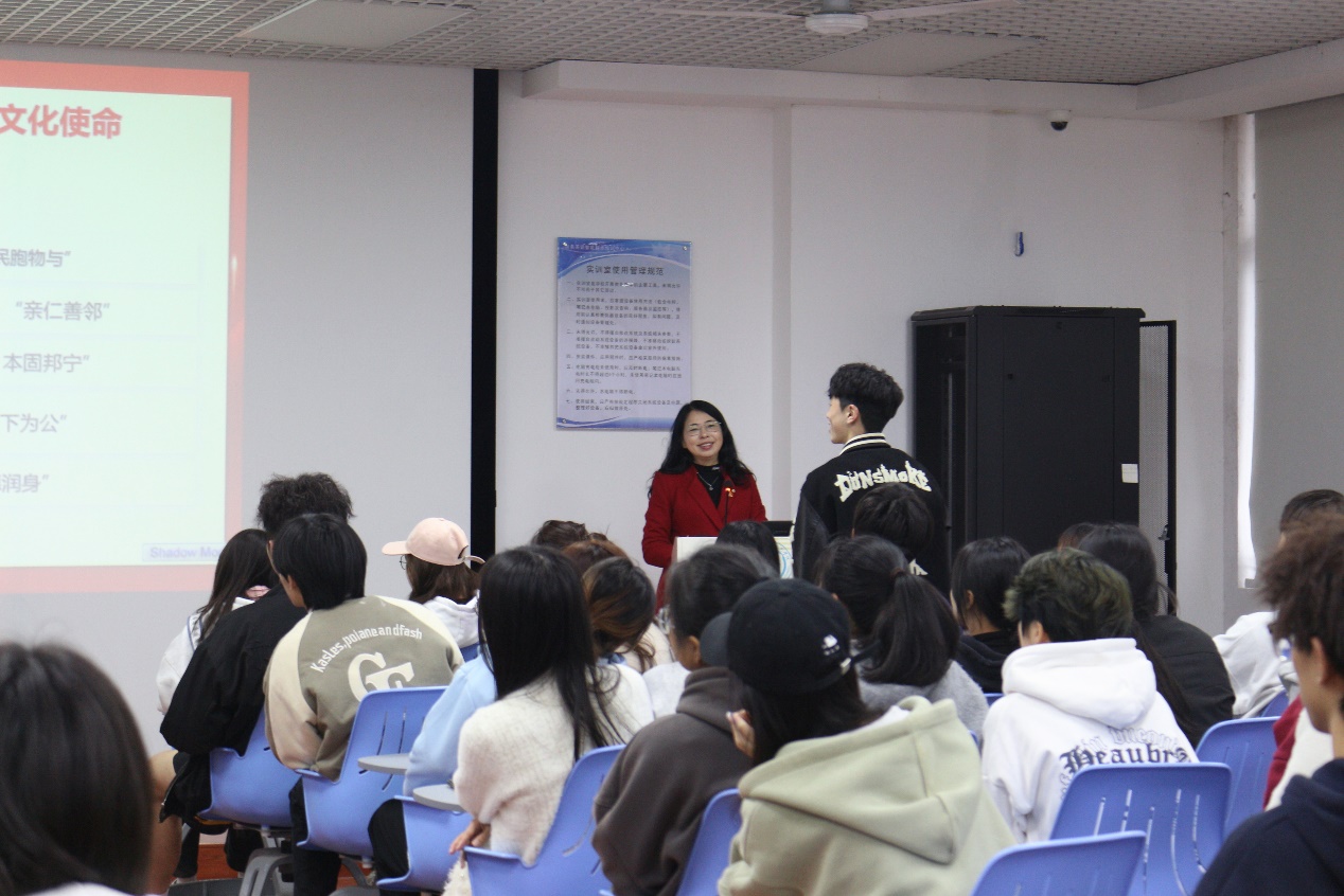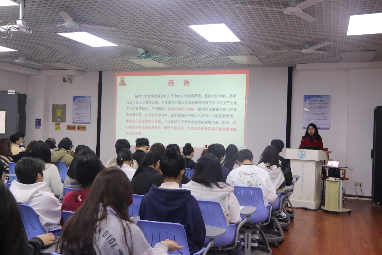 彭枚芳主要从以下三个部分讲述习近平文化思想。第一,习近平文化思想的提出。在呈现习近平文化思想形成脉络的同时,彭枚芳带领同学们深入学习中华文化与文化自信的内涵,并结合同学们的校园生活强调意识形态安全问题,让习近平文化思想深入同学们的心中。第二,全面领悟习近平文化思想。彭枚芳从中华优秀传统文化是中华民族的根和魂、建设中华民族现代文明是新时代新的文化使命、习近平文化思想是建设中华民族现代文明的强大武器和科学行动指南三个方面带领同学们领悟习近平文化思想。同时她采用视频与活动相结合的方式,与同学们进行课堂互动,让大家更为深入的认识中华文化,坚定文化自信。第三,引导外语学院学子担负学院高质量发展新使命。彭枚芳希望同学们坚定文化自信自强,树立坚定理想信念;推动中华文化创新创造,厚植爱国主义情怀,传承弘扬中华优秀传统文化,彰显中国价值;讲好中国故事,提升中华文化软实力和影响力。