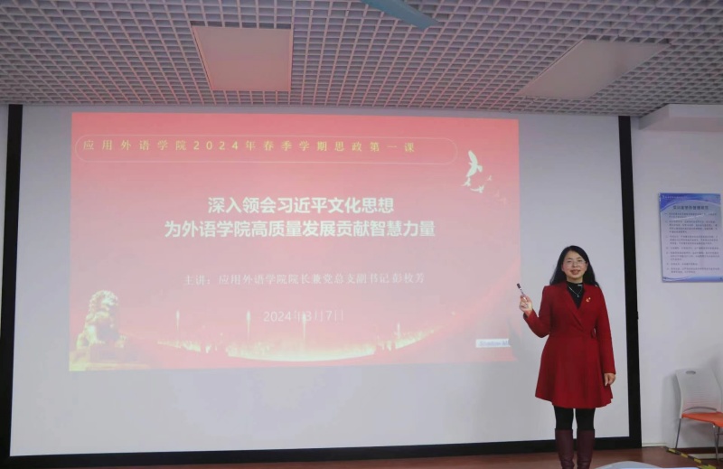为深入领会习近平文化思想,增强青年学子对党和国家的热爱,为外语学院高质量发展贡献智慧力量。3月7日,应用外语学院院长彭枚芳在白云校区实训楼602开讲 “思政第一课”。学院辅导员和入党积极分子参加本次讲座。