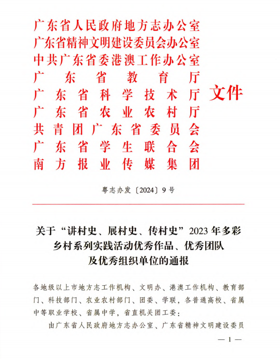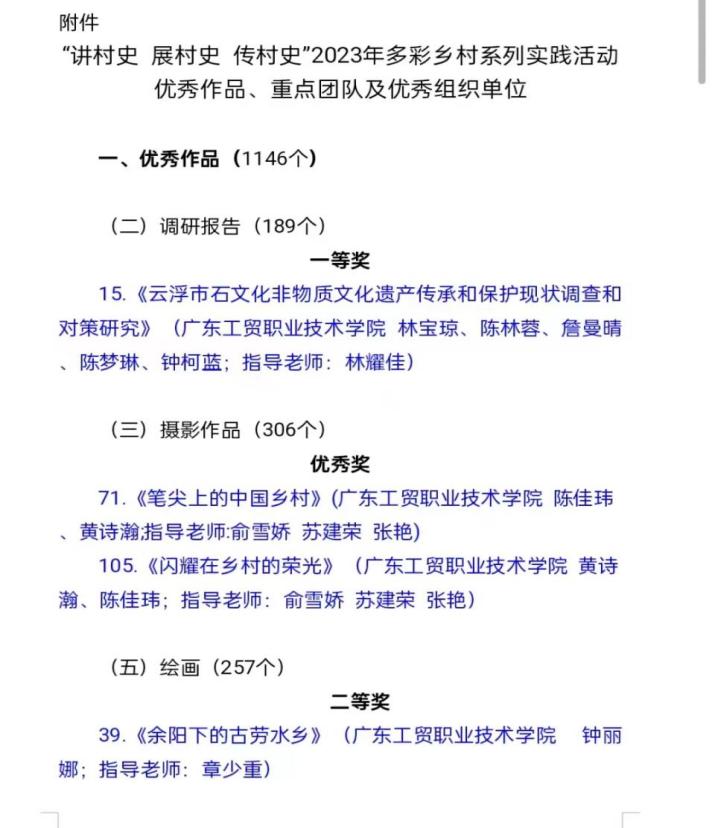 近日,由广东省人民政府地方志办公室、广东省教育厅、团省委等九部门联合组织开展的“讲村史 展村史 传村史”2023年多彩乡村系列实践活动公布评选结果,菲律宾亚星222官网师生获调研报告一等奖1项、绘画作品二等奖1项、摄影作品优秀奖2项。学校荣获优秀组织单位。