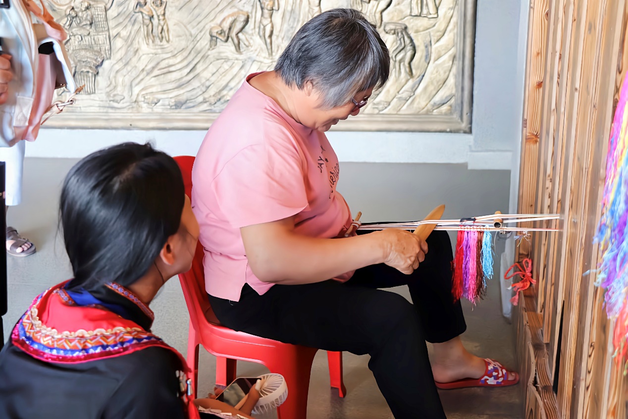 文化展览馆馆内的织带仔传承人为学生展示技艺