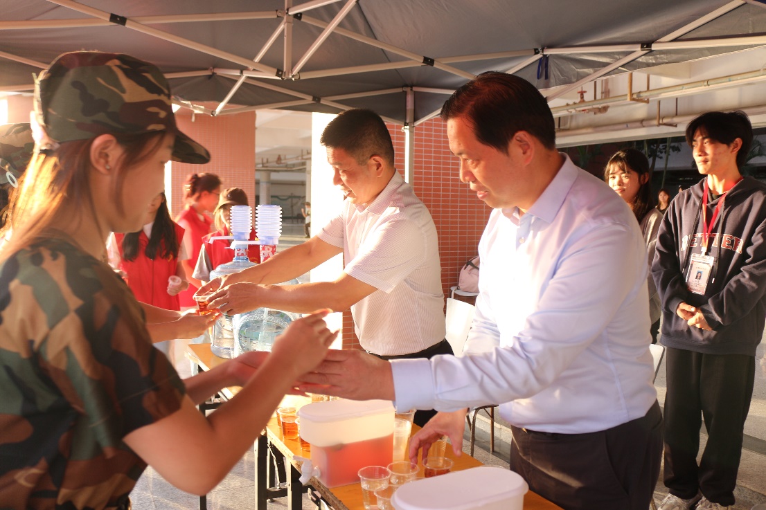 为深入推进“一站式”学生社区建设,以“围绕学生、关照学生、服务学生”为出发点,以满足学生切实所需为落脚点,应用外语学院军训期间组织学生党员和入党积极分子们在现场持续开展“军训送清凉,关怀入人心”活动,为军训新生送去烈日清凉与温暖关怀。走访现场,学校领导对送清凉活动表示充分肯定,也为参与现场服务的党员和入党积极分子点赞。期间,学校领导还亲手为新生们送上解暑清凉茶水,并亲切询问了新生们的身体状况和军训中遇到的困难和问题,鼓励他们勇敢面对挑战、积极参加训练。