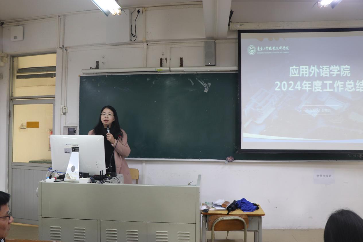 胡红玲副院长对教学工作进行了总结。她提到了本学期的教学检查、实习实训、英语角活动、工作量统计以及试卷审核等工作情况。同时,她对下学年的工作计划进行了详细规划,包括围绕职责分工开展工作,进一步拔高大学英语四、六级通过率,将其从当前以大英教研室为主体,逐步内嵌至全院的每一门专业课程;加强实习实训和横向服务;推动科研工作,鼓励发表高水平论文;大力推进商务英语专业建设,开展校企共建课程、产业学院等项目。