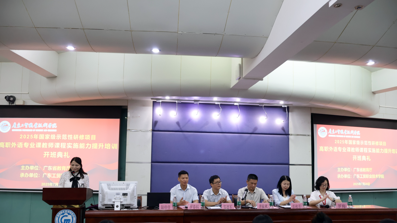 7月20日上午,由广东省教育厅主办、我校应用外语学院承办的广东省2025年职业院校教师素质提高计划项目——高职外语专业课教师课程实施能力提升(国培)班在学校天河校区西区报告厅开班。学校党委委员、副校长唐毓秋,培训与继续教育学院院长邹德军,应用外语学院党总支书记罗春科、院长彭枚芳,项目负责人陆佳佳、罗梅及全省30所职业院校的40名外语骨干教师出席开班典礼,开班仪式由陆佳佳主持。