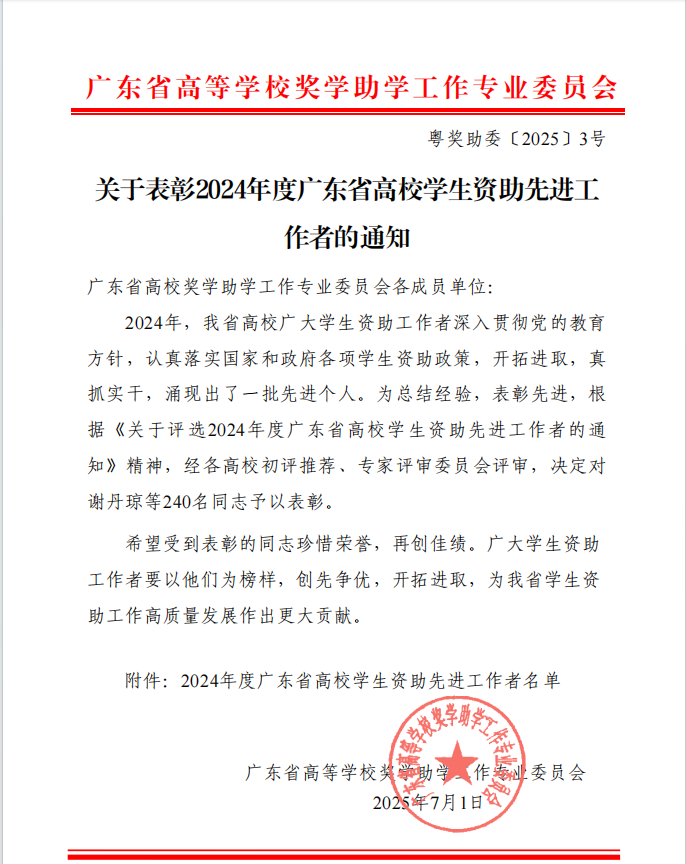 近日,广东省高等学校奖学助学工作专业委员会发布《关于表彰2024年度广东省高校学生资助先进工作者的通知》(粤奖助委〔2025〕3号),对2024年在学生资助工作中表现突出的240名先进个人予以表彰。我校刘洋曦文、古明倩两位老师获此殊荣!