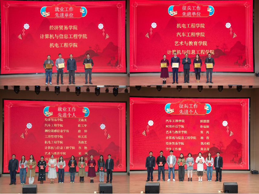 会议对2025年度在就业及征兵工作中表现突出的先进集体与先进个人进行了表彰。学校领导为获奖代表颁奖,激励全体人员以先进为榜样,共同推动工作再上新台阶。