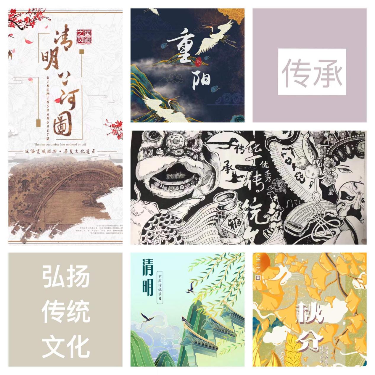 为大力弘扬中华优秀传统文化,推动传统文化创新性发展,并与人们精神文化需求相契合,有效地吸引和感染学生,增强学生的参与感、认同感、获得感,营造有利于传承与弘扬中华优秀传统文化的良好校园氛围。特此,面向广大在校工贸学子,开展以“传承与弘扬中华优秀传统文化”为主题的广告设计征集活动。11月底,在艺教学院开始了广泛的宣传,发布比赛海报到各个班群,充分调动学生的积极性。同时,欧梓楠老师和隋嫦婉老师还利用课余时间深入到学生中宣传传统文化知识以及讲解海报设计的表现手法和形式。经过近半个月的时间,收集到的学生作品有100多张,主要为艺教学院的学生,同时还有其他校区的同学通过不同方式转交过来的部分作品。通过比赛,让同学们在潜移默化中受到中华优秀传统文化的熏陶,推动传统文化在新一代年轻人中能更好地发展和传承。经过老师们的认真评选,20视传2班梁殷铭、20视传3班郑新强、21视传2班汤婉珊、20视传2班林荣庭四名同学获得校级一等奖,20视传1班黄明祥、20视传1班丁华圳、20视传2班彭茂青、20视传3班许洪铭、21学前1班郑佳彤、20数艺2班蔡荣杰等六名同学获得二等奖,21视传1班曹晓丹、20视传1班陈思宇、20视传1班简心怡等十名同学获得三等奖。