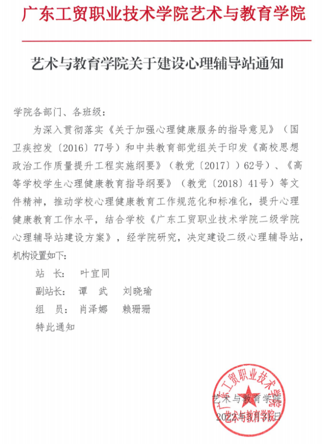 为深入贯彻落实《关于加强心理健康服务的指导意见》(国卫疾控发〔2016〕77号)和中共教育部党组关于印发《高校思想政治工作质量提升工程实施纲要》(教党〔2017〕)62号)、《高等学校学生心理健康教育指导纲要》(教党〔2018〕41号)等文件精神,推动学校心理健康教育工作规范化和标准化,提升心理健康教育工作水平,结合学校《菲律宾亚星222官网二级学院心理辅导站建设方案》,经学院研究,3月31日正式成立二级心理辅导站,4月18日已完成挂牌仪式。