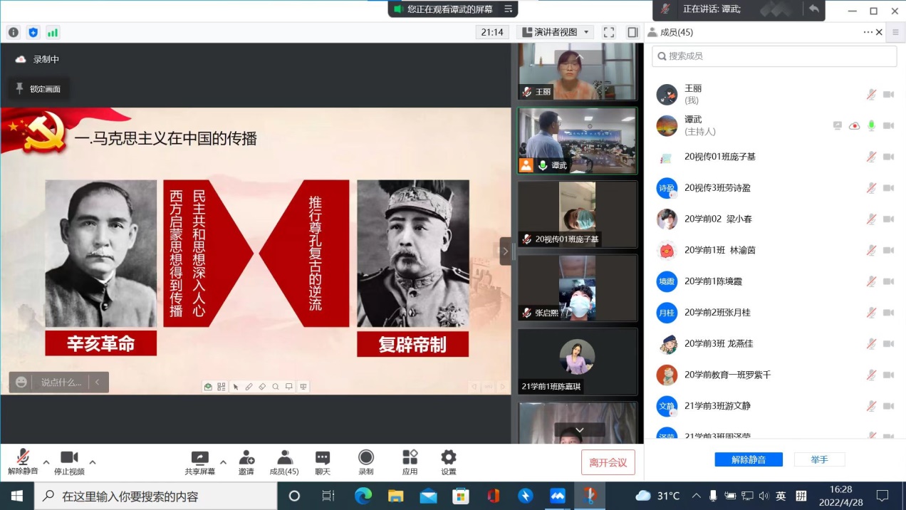 2022428日下午,艺术与教育学院学生党支部开展了专题党课学习,党课由学生党支部书记谭武同志主讲,采用线上+线下的方式进行,学院党总支副书记叶宜同同志与学生党支部全体党员、发展对象以及入党积极分子一起,共79人参加了党课学习。