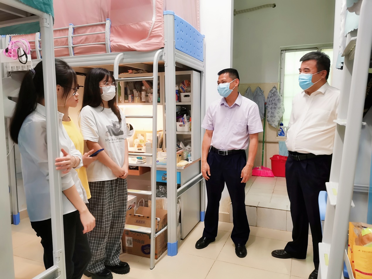 6月21日中午,许副校长在学院党总支书记沈彬、副书记叶宜同及相关人员陪同下走访了艺教学院学生居住的学生3栋和5、6栋宿舍。在学生宿舍,与学生面对面交流,详细询问学生的家庭情况和在校园的学习生活感受,欢迎同学们对学校的教育教学管理工作提出好的意见和建议。许副校长仔细察看学生的住宿条件和生活环境,叮嘱同学们一定要做好自我防护,虽然新冠肺炎疫情形势有所缓解,但还未到放松的时候,疫情防控不松懈,还要注意防流感。同时希望同学们在潜心学习的基础上也要到校园多锻炼身体,进一步提高自我防护能力。