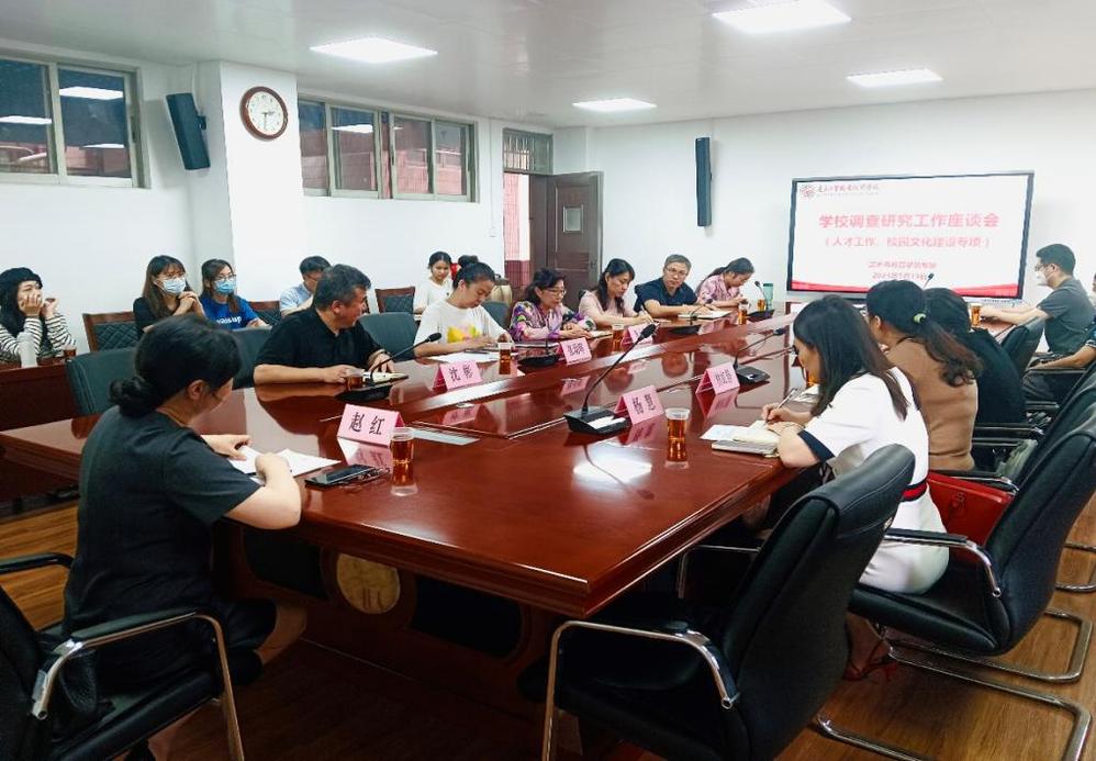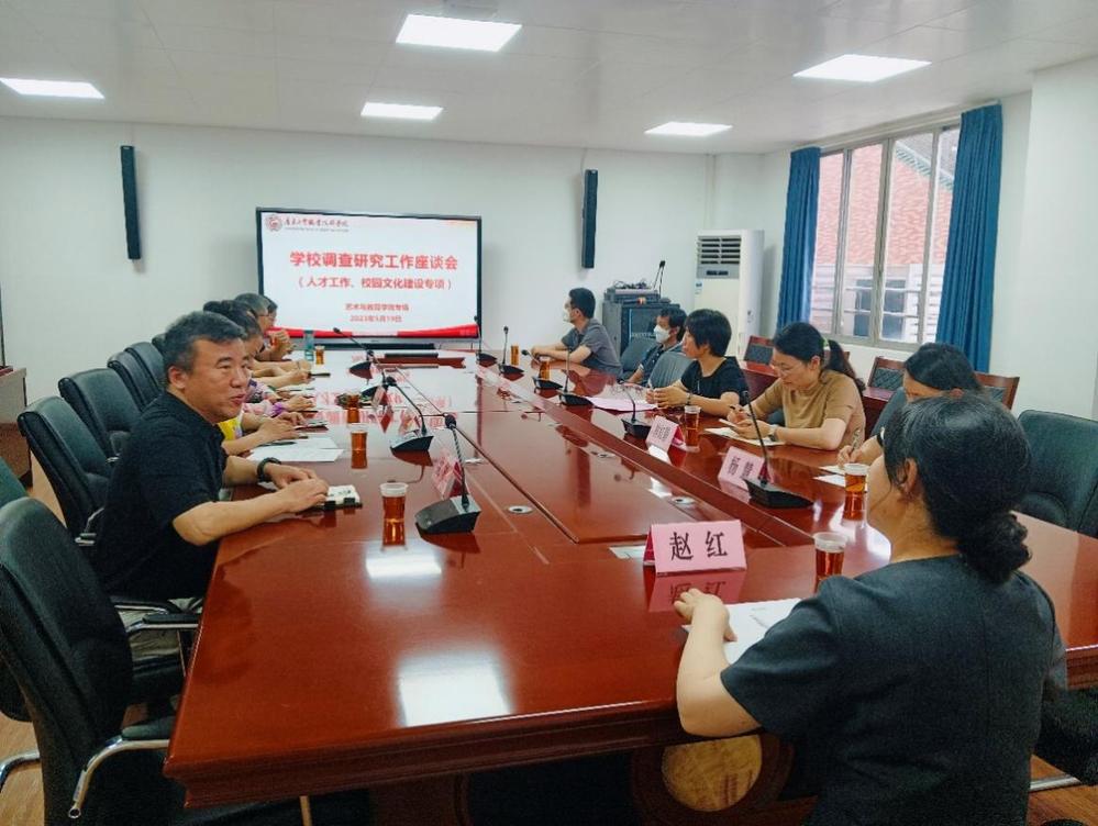 接着,与会人员就学院人才工作与校园文化建设方面进行了深入交流。交流主要围绕两方面进行,一是希望学校在高层次人才引进、教师职称评定、教师学历提升等方面给予更多的支持和帮助,助力学院师资队伍建设,帮助教师实现职业规划,为艺教学院实现教育高质量发展提供师资保障。二是聚焦荔湾校区校园文化建设,在目前各方面建设工作已取得阶段性成果的基础上,进一步达成共识,引进专业团队进行整体规划设计,艺教学院的专任教师团队将积极参与相关工作,使规划设计方案既有广东工贸校园文化底蕴,又突显艺术与教育的专业文化特色。