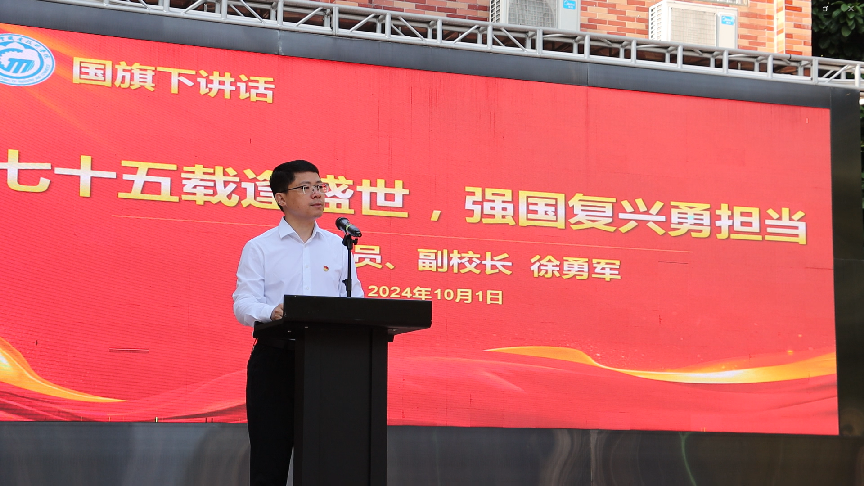 升旗礼毕,党委委员、副校长徐勇军发表了《七十五载逢盛世,强国复兴勇担当》的国旗下讲话。他首先代表学校党委向全体师生致以节日的问候。接着,他回顾了新中国从成立到复兴的辉煌历程以及中华民族在奋斗中取得的伟大成就。他号召全体师生肩负起实现中华民族伟大复兴的使命,强调了教育的重要性以及个人梦融入中国梦的必要性,并激励全体师生在新征程上跑出最好成绩,为职业教育和国家发展贡献力量。