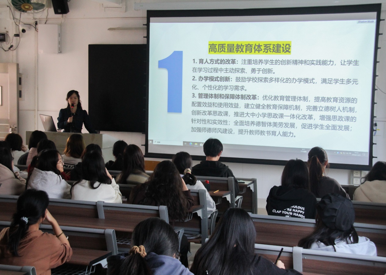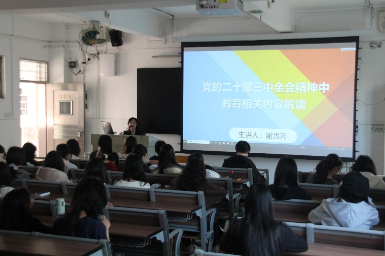 为深入学习贯彻党的二十届三中全会精神,2024年11月21日,学校“六队百人”宣讲团成员谢思芹面向学前教育专业学生举办了一场主题为“党的二十届三中全会精神中教育相关内容解读”的宣讲活动,学前教育专业50多名同学参加了活动。