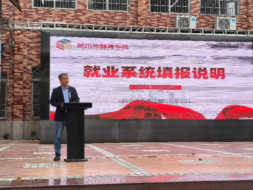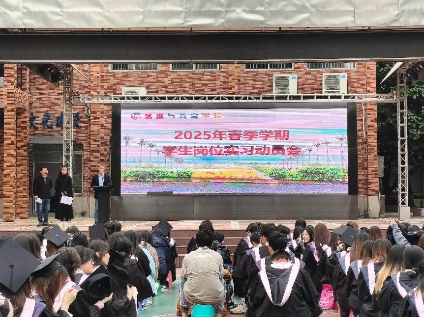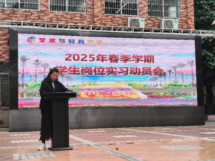 为落实学院教学部署,提高人才培养质量,帮助同学们树立正确的实习观念,明确实习要求,12月26日下午14点,艺术与教育学院在荔湾校区篮球场召开2022级学生岗位实习动员会。本次会议由艺术与教育学院学工办主任谭武主持,学院院长张幼晖、副院长彭金奇出席会议并发表讲话,2022级全体在校生以及岗位实习指导老师到场聆听。