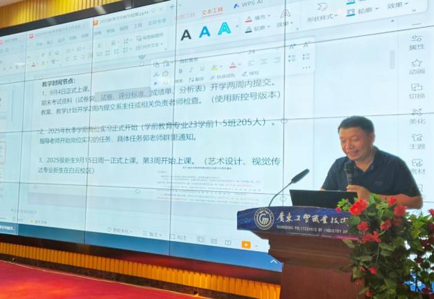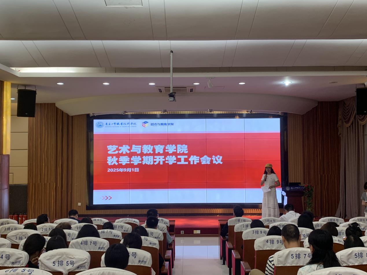 秋风送爽启新篇,凝心聚力谋发展。9月1日上午9:00,艺术与教育学院在荔湾校区报告厅召开2025年秋季学期开学工作会议。学院院长张幼晖主持会议,新任党总支书记李繁、副书记代启兵、副院长彭金奇及全体教职工参会,共同为新学期锚定方向、凝聚合力。