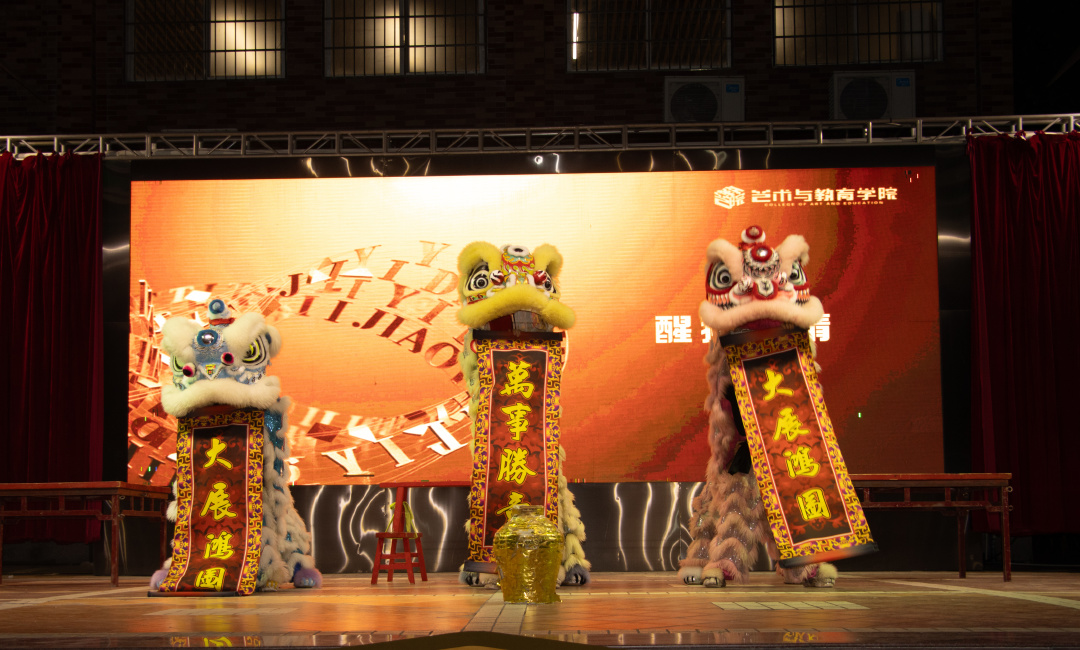 领导致辞后,醒狮点睛仪式拉开序幕。受邀领导手持朱砂笔,依次为醒狮点左眼、右眼、额头、狮嘴,分别寄托“明学业方向”“聚师生情谊”“创学院辉煌”“享阖家幸福”的美好祝愿。随后,学校白云校区醒狮队带来《金狮贺岁》表演,雄狮腾跃、锣鼓喧天,既彰显传统文化魅力,又为现场注入喜庆氛围,赢得师生阵阵掌声。