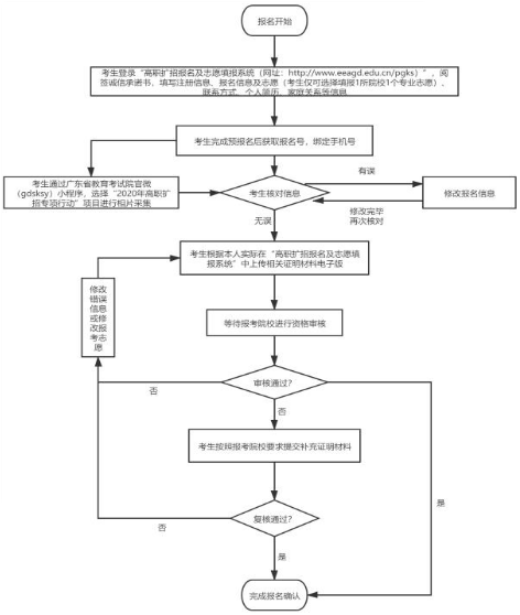 考生登录广东省高职扩招报名及志愿填报系统(http://www.eeagd.edu.cn/pgks),根据系统指引阅签诚信承诺书,填写注册信息、报名信息及志愿信息、联系方式、个人简历、家庭关系等信息,获取报名号、绑定手机号,通过微信小程序采集相片并经核对信息无误后根据实际按照要求上传相关证明材料电子版。高职扩招报名及志愿填报工作全部在网上进行,时间为9月29日9:00至10月9日17:00,逾期不再办理相关手续。