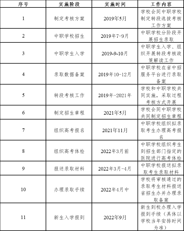 对口中职学校在规定时间内依据学生自愿参加转段考核情况组织学生报名和进行报考资格初审;广东省进城务工人员随迁子女的材料,由各中职学校集中收集并送地市招办审核后,统一提交我校。报名完成后由我校统一在普通高考录取系统输入和校对参加转段考核学生信息。