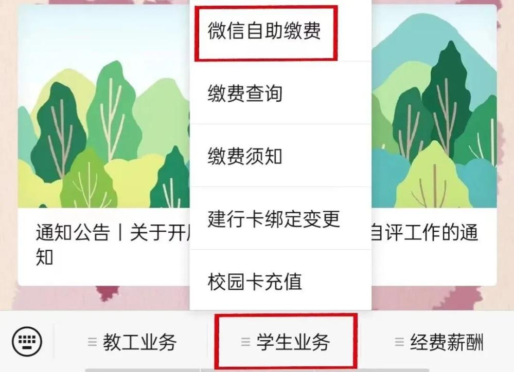 2.进入公众号,点击“学生业务”→“微信自助缴费”;