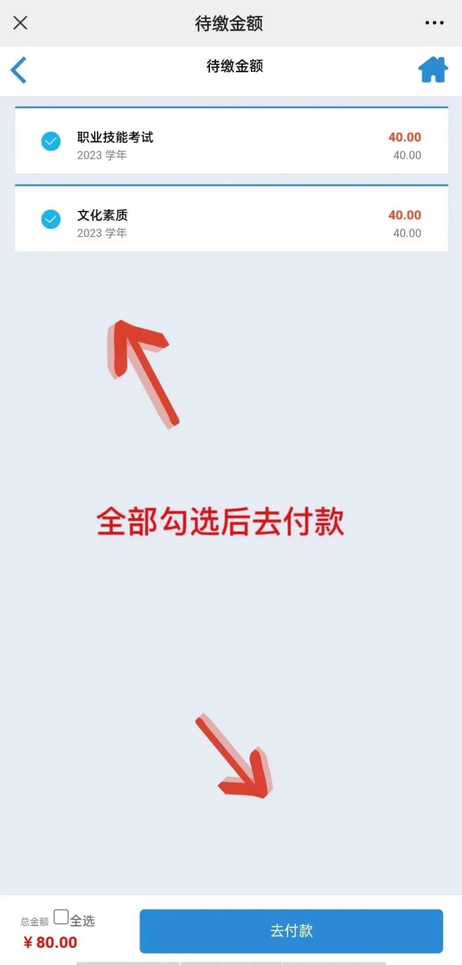 5.选择缴费项目(如:文化基础考试费)→去付款,付款成功后可看到缴费记录。